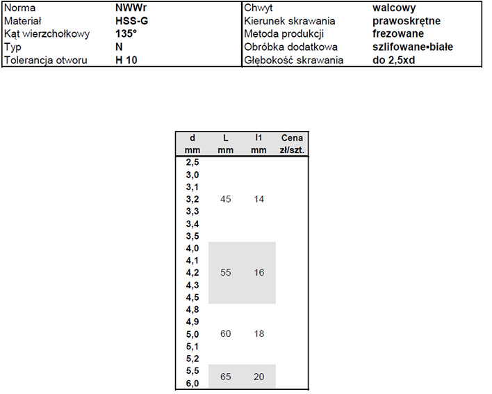 Profesjonalne dwustronne szlifowane wiertła do metalu wykonane ze stali szybkotnącej HSS. Wiertła prawoskrętne, szlifowane – białe, frezowane, o kącie ostrzenia 135º i tolerancji otworu H10. Typ N. .